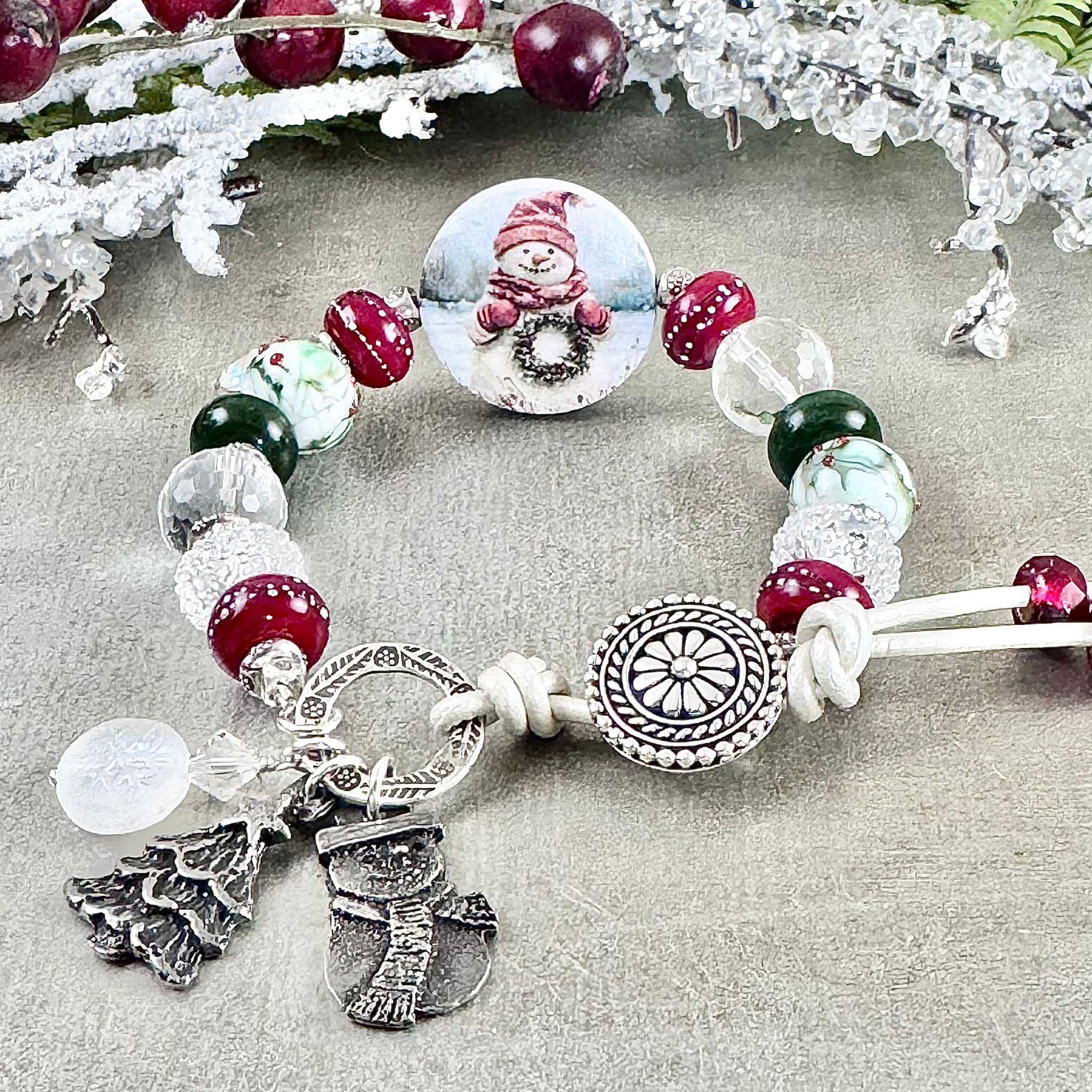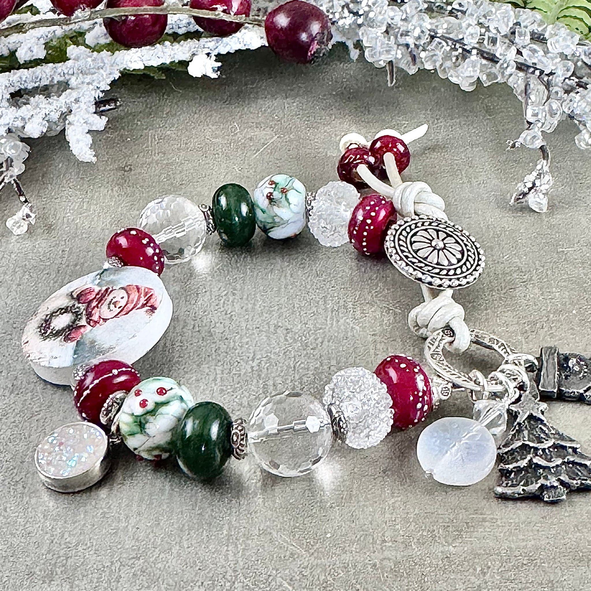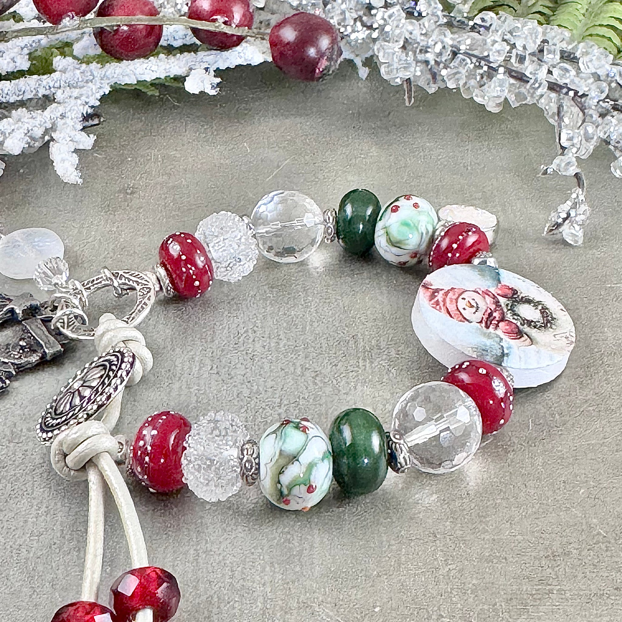 One of a kind bracelet with an adorable snowman decoupage image on wood bead, image on both sides. This has been paired with beautiful artisan glass lampwork beads. These include red rondelles drizzled with fine silver, rondelles covered in greenery and berries, dark green rondelles and clear glass icy rondelles. Also included are faceted clear quartz rounds.