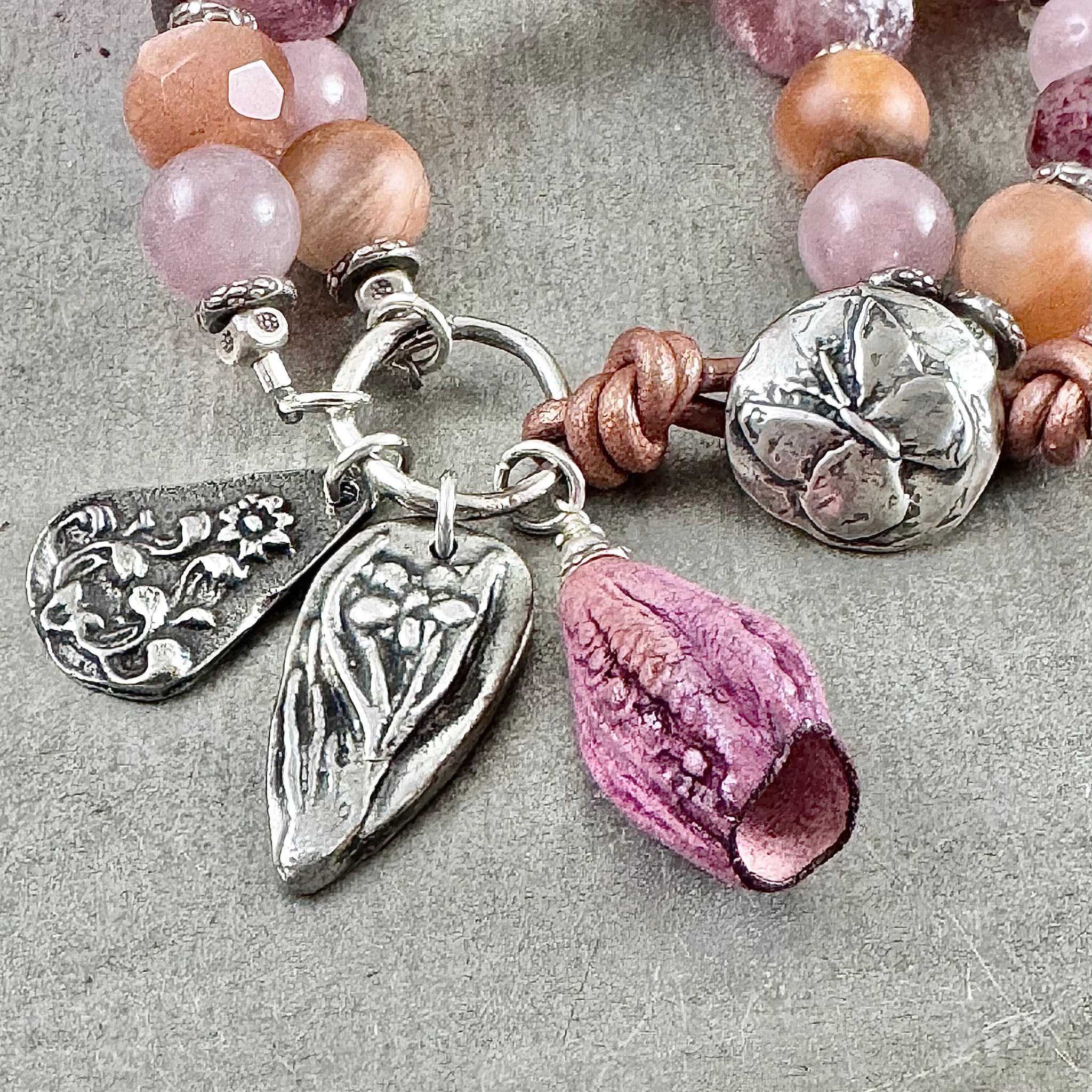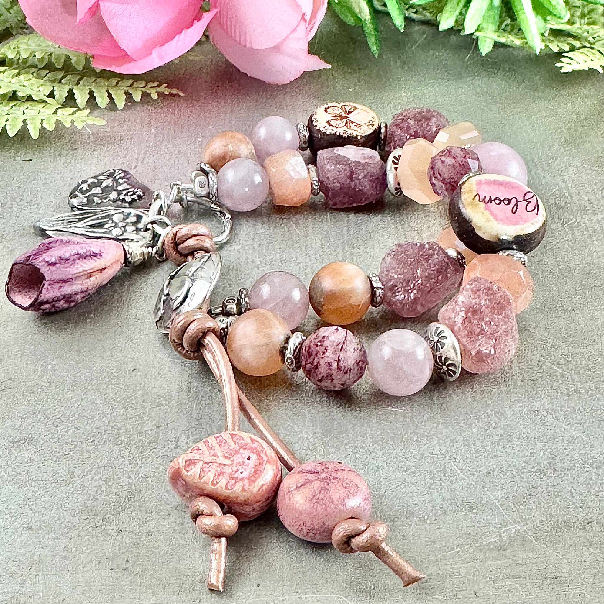 This one of a kind bracelet is filled with springtime colors! One focal is an artisan ceramic bead with the word “Bloom”. The other focal is a large round of beautiful Madagascar rose quartz. Another smaller artisan ceramic bead has a butterfly on one side and the words “She Changed”. The other beads are a combination of raw strawberry quartz nuggets and faceted rounds, shimmering sunstone faceted wheels, peach moonstone in faceted nuggets and matte rounds and Madagascar rose quartz rounds.