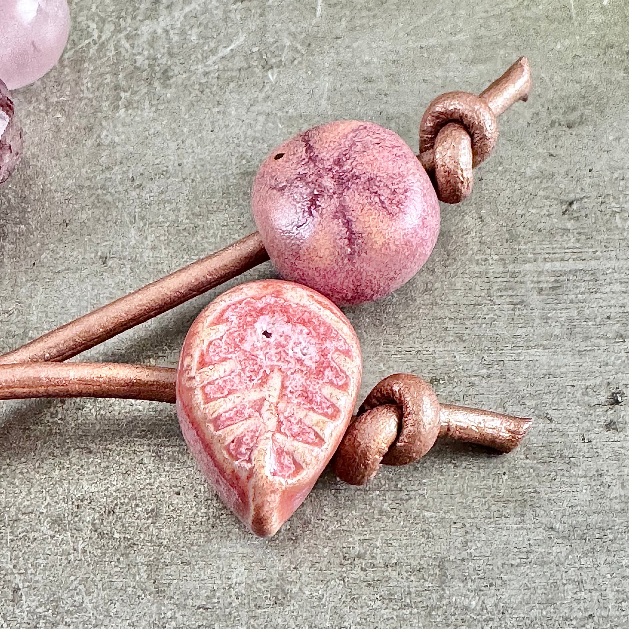 The closure is an artisan sterling silver butterfly button. This fits through a loop of metallic coppery leather cord which is knotted onto an artisan sterling silver link. Knotted onto the leather ends are artisan mismatched ceramic beads. Hanging from the link is an amazing artisan ceramic flower pod and two artisan pewter floral charms.