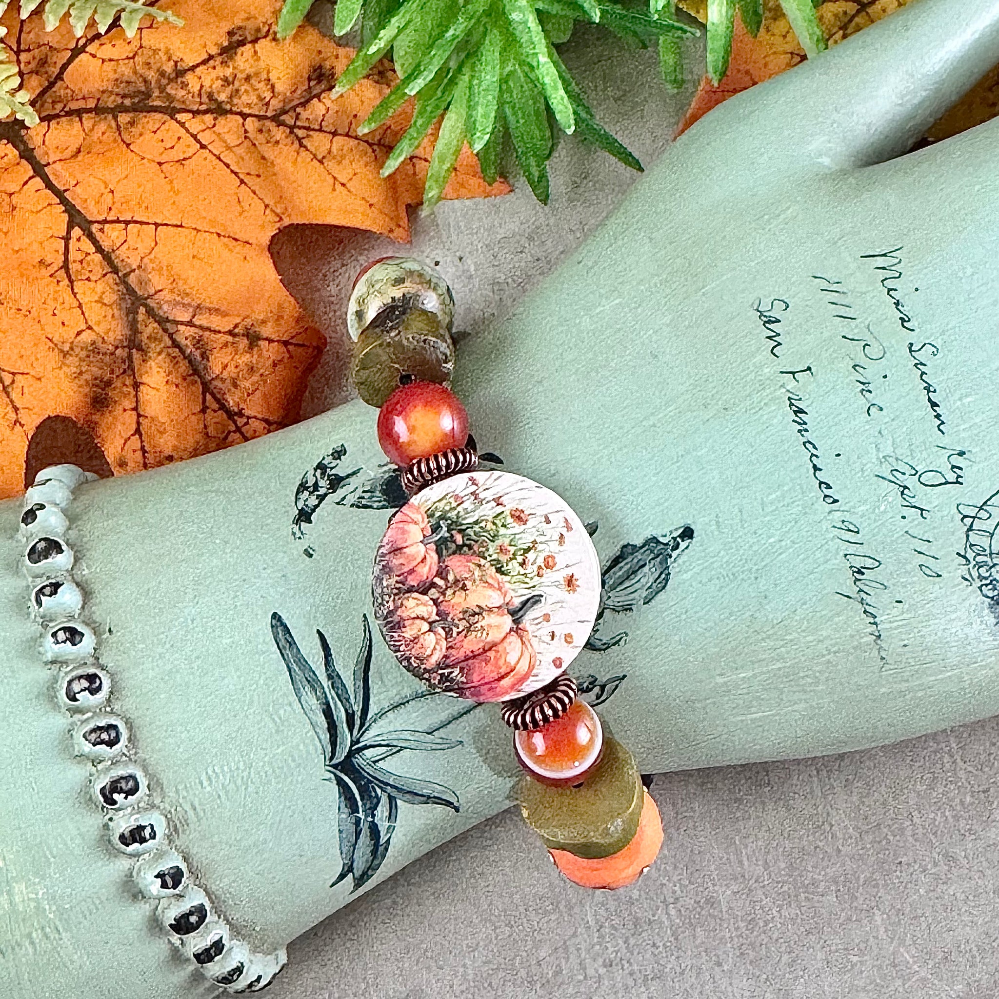 This is a one of a kind stretch bracelet with a darling pumpkin focal bead, which is decoupage on wood, image on both sides. I’ve paired this with two artisan lampwork beads in a matte orange, one with fine silver dots, two artisan ceramic beads, one with a fall harvest design and one green floral round, carnelian rounds, rustic green turquoise wheels, and a green African recycled glass bead. Copper beads are placed throughout.