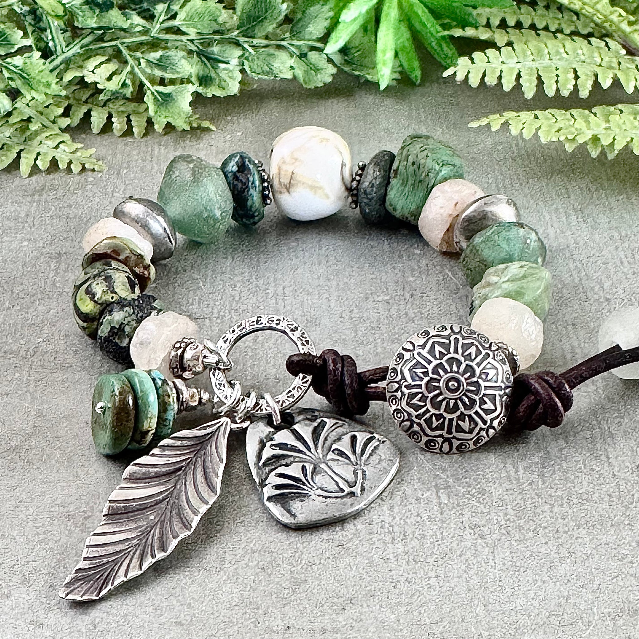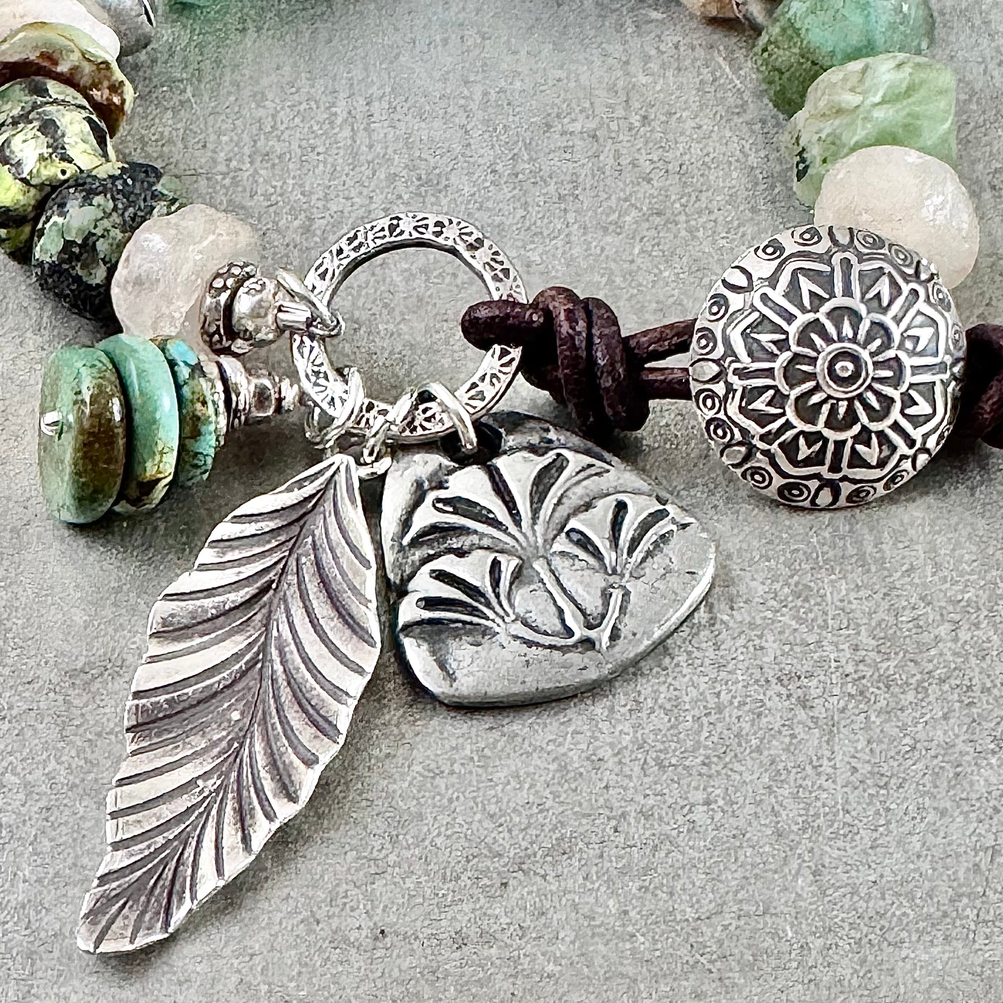The closure is a hand stamped Karen Hill Tribe fine silver button and link. The button fits through a loop of dark brown leather cord that is knotted onto the link. Knotted onto the leather ends are white African recycled glass beads. Hanging from the link is an artisan pewter ginkgo leaf charm. The Ginkgo symbolizes hope, strength and resilience. Also included is a beautiful Karen Hill Tribe fine silver leaf charm and a green turquoise dangle.