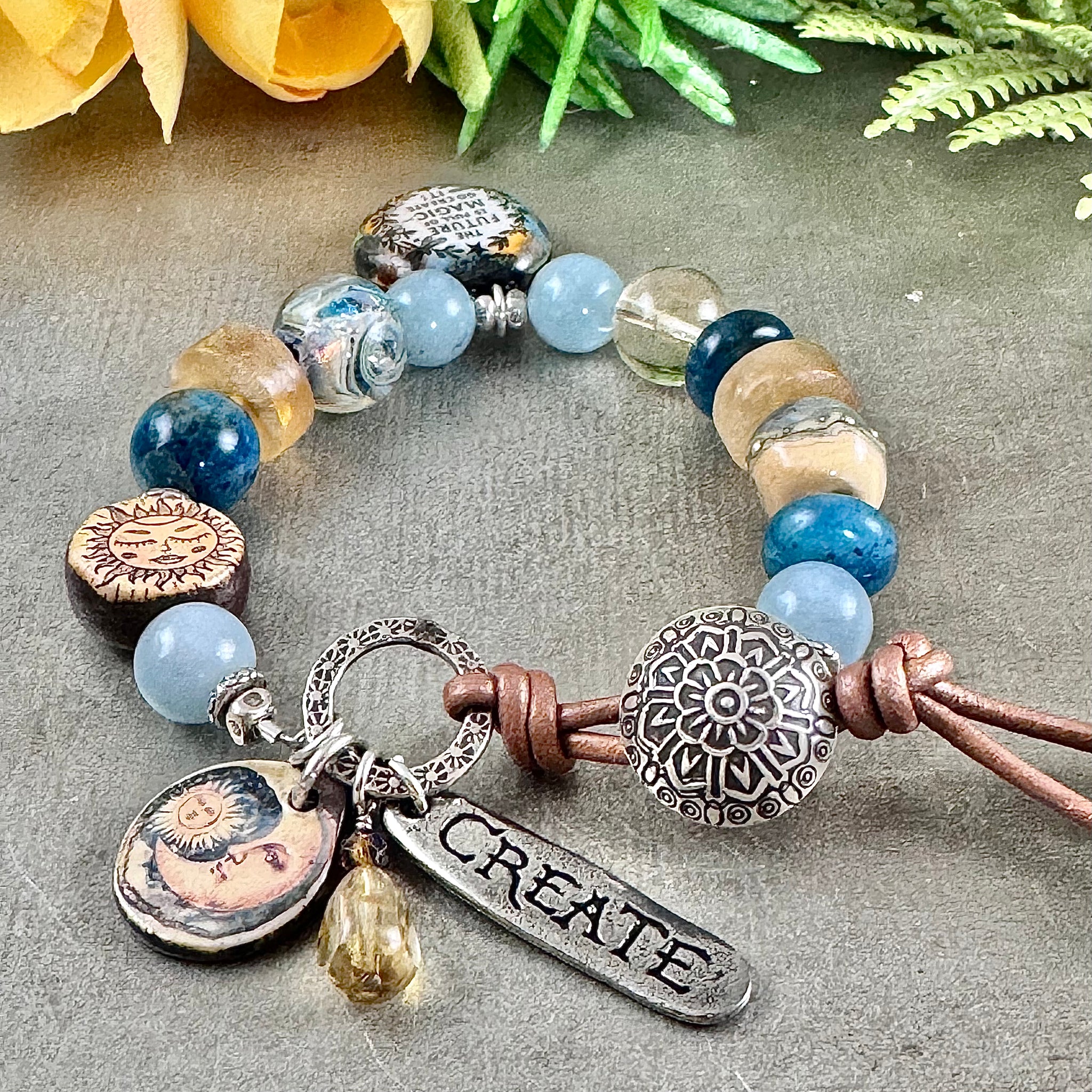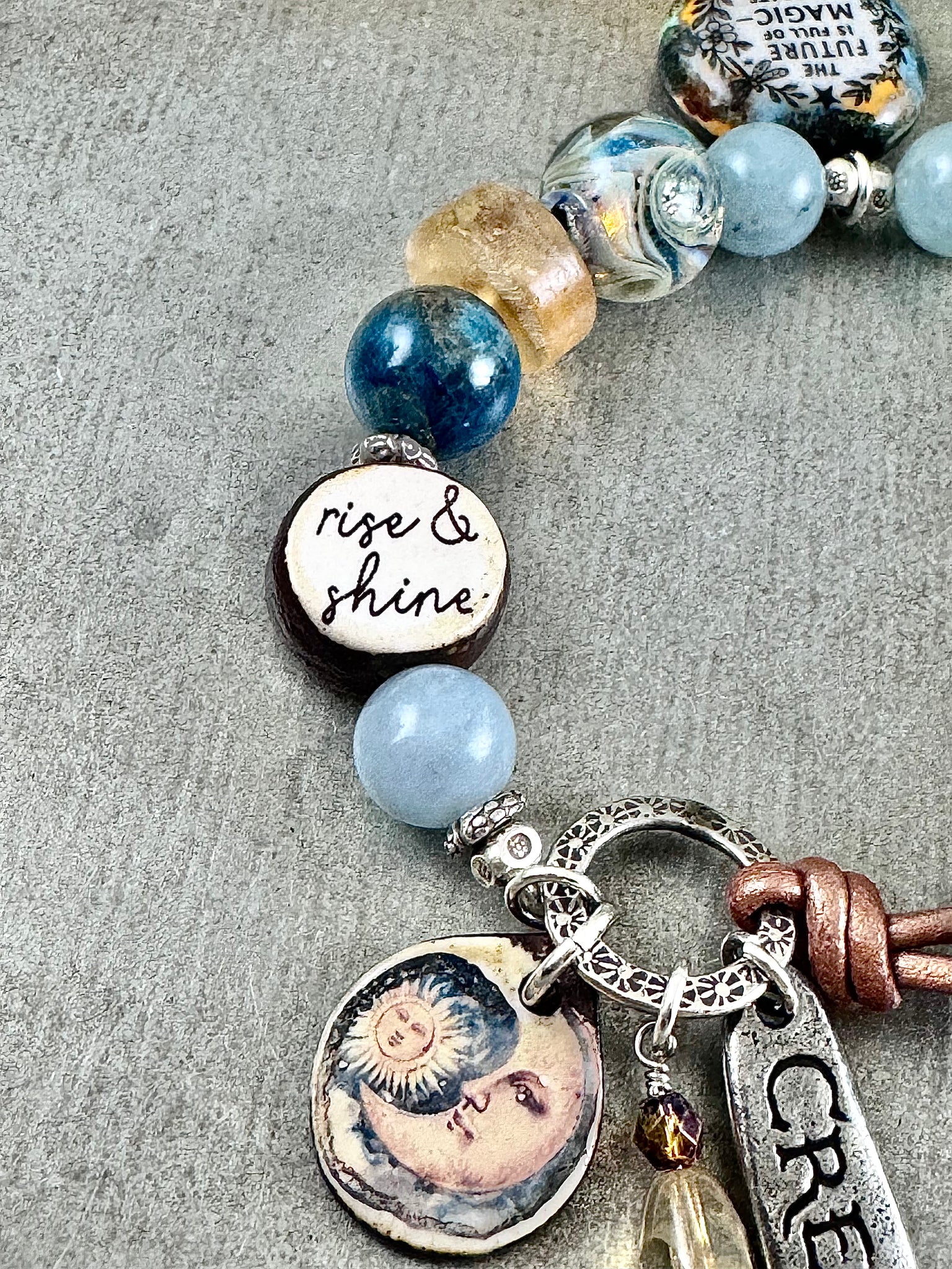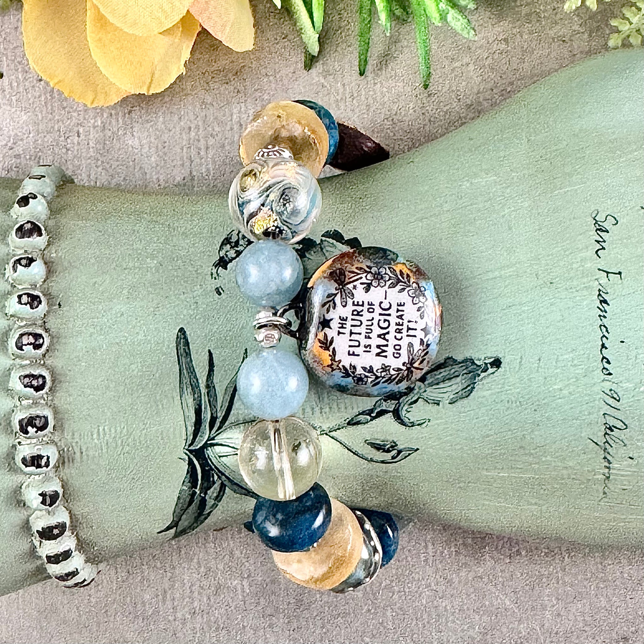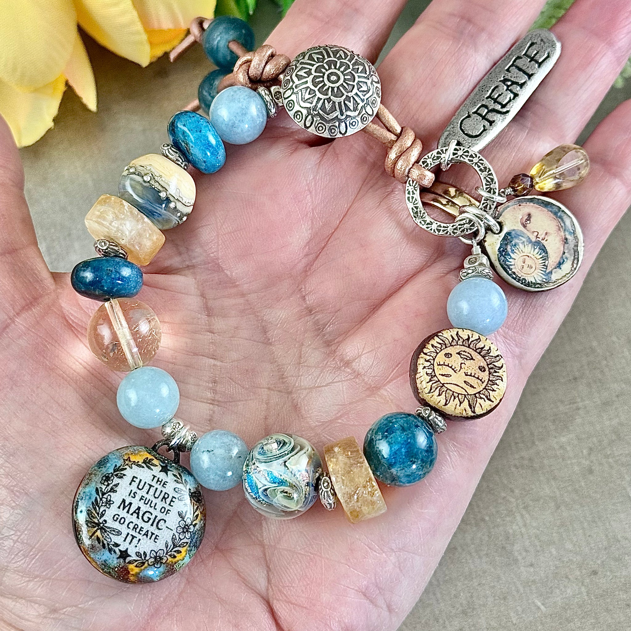 This one of a kind bracelet has an amazing one of a kind artisan focal charm / pendant which says “the future is full of magic - go create it!” This piece is kiln-fired glass which is then hand paint with high-fire enamels and ceramic pigment. I paired this special piece with an array of beads which include two glass lampwork beads, one with swirls of different tones of blues and gold, and an artisan ceramic yellow sun bead with the words “rise and shine” on the back. Stone beads include aquamarine rounds, a citrine round, large matte citrine wheels, an apatite round and large apatite rondelles.