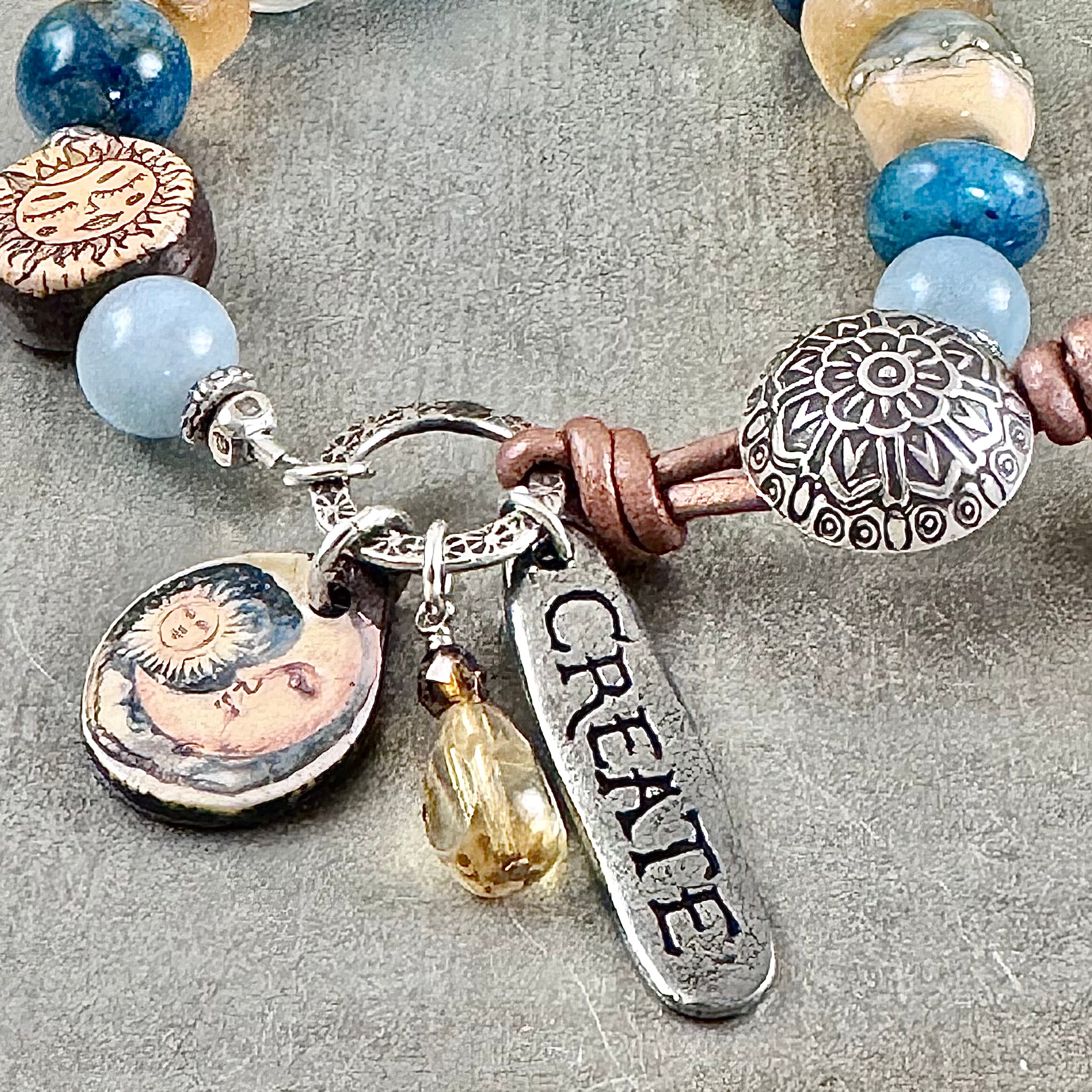 The closure are hand stamped fine silver button and link. The button fits through a loop of copper toned leather cord which is knotted onto the link. Knotted onto the leather ends are blue African recycled glass beads. Hanging from the link is an artisan pewter “Create” charm, an artisan ceramic sun and moon charm and a Czech glass dangle.