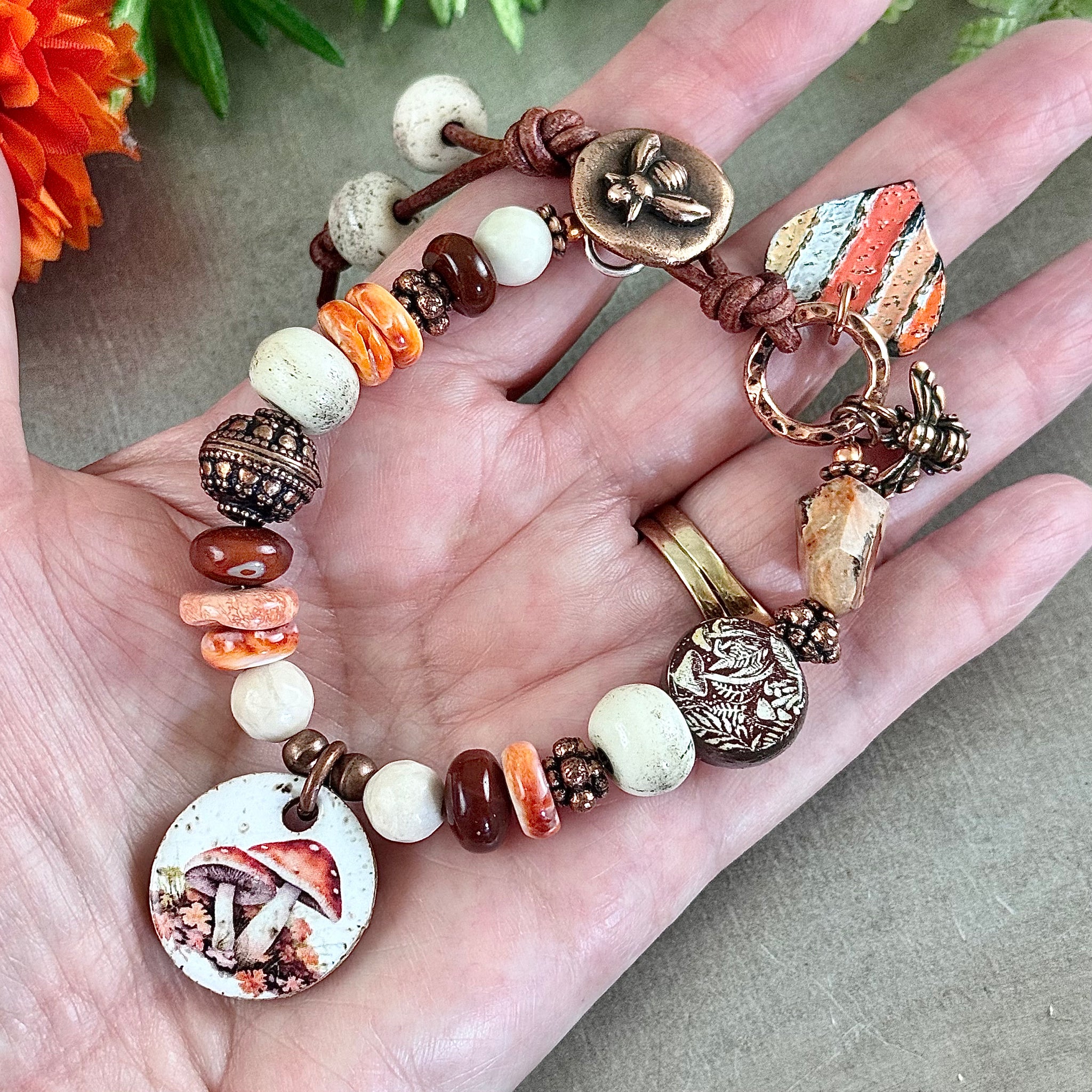 The focal for this one of a kind bracelet is an artisan ceramic charm with mushrooms in lovely fall colors. I paired this cute charm with an artisan ceramic mushroom bead with the words “tread softly”on the back, beautiful spiney oyster discs, Mexican fire opal rondelles in peachy orange and rich browns, a Mexican fire faceted nugget, faceted river stone rounds and rustic bone beads made in Nepal. Metal includes a stunning copper Bali style round bead, copper Bali style thick spacer beads and small copper rounds.