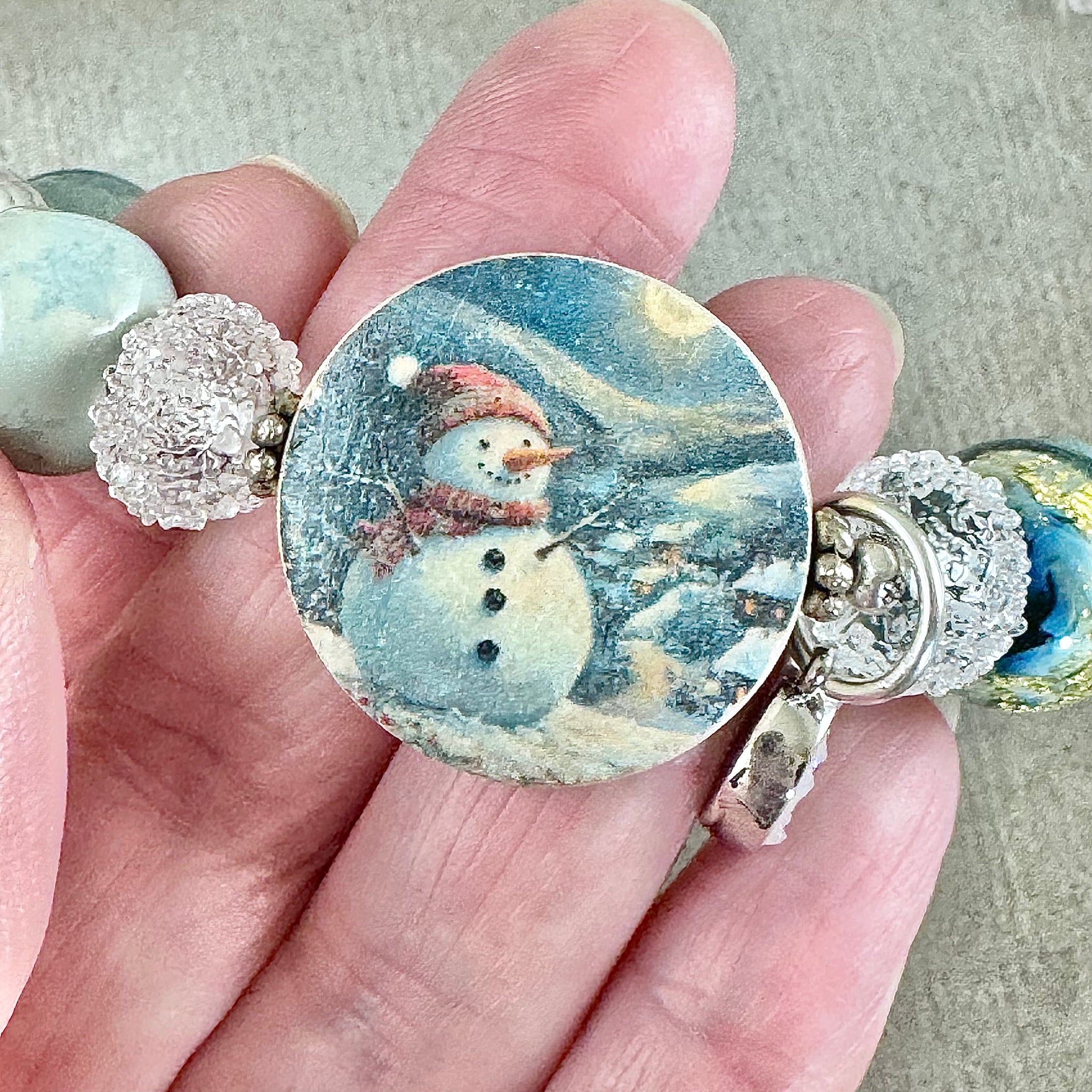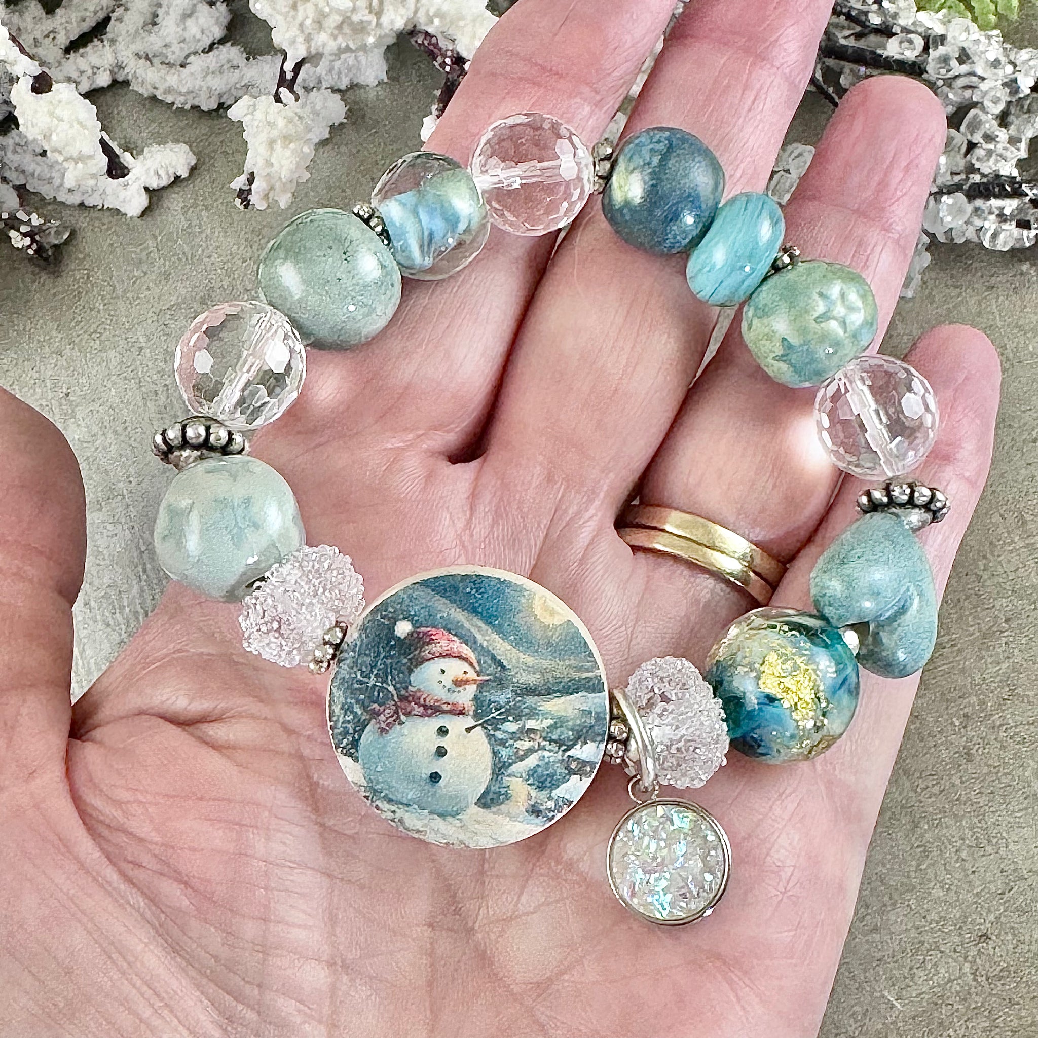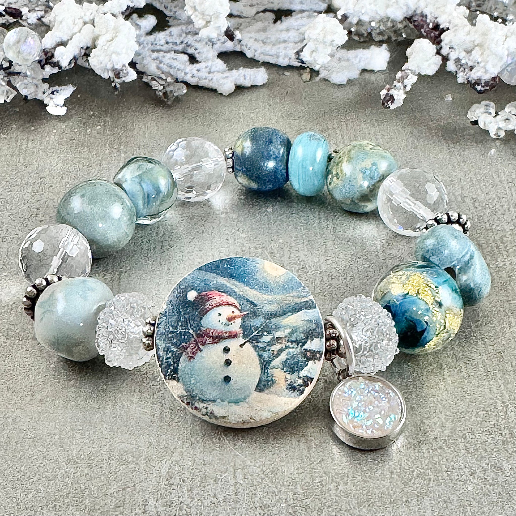 This one of a kind stretchy bracelet features a decoupage wood bead with an adorable snowman in the moonlit evening, image on both sides. I paired this with an assortment of artisan glass lampwork beads in various shades of blues, one with gold glitter, artisan lampwork beads in clear glass covered in “sugar” texture, artisan ceramic beads including a sweet heart shape and beautiful faceted quartz rounds. Pewter beads are used throughout. A glimmery frosty charm hangs in front.