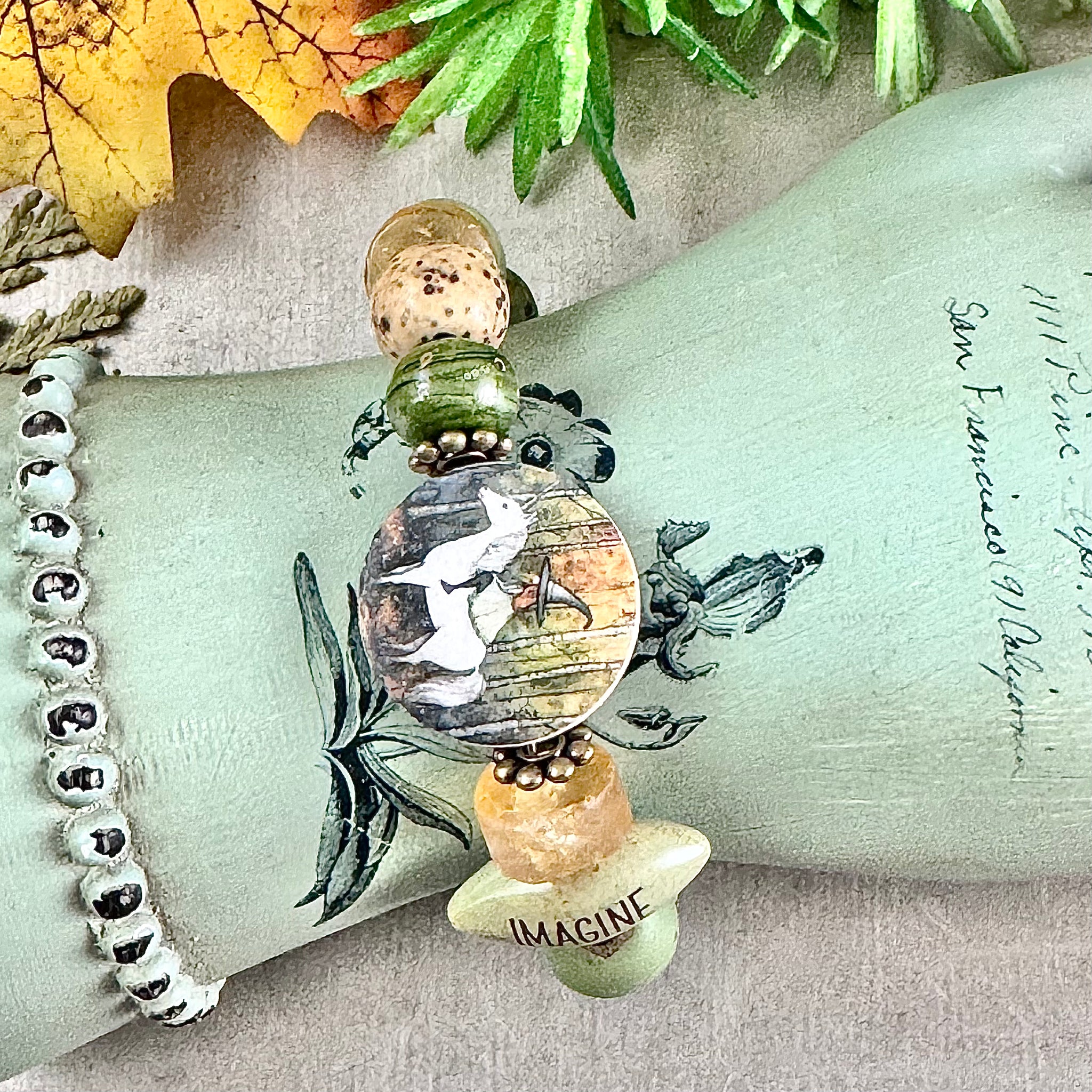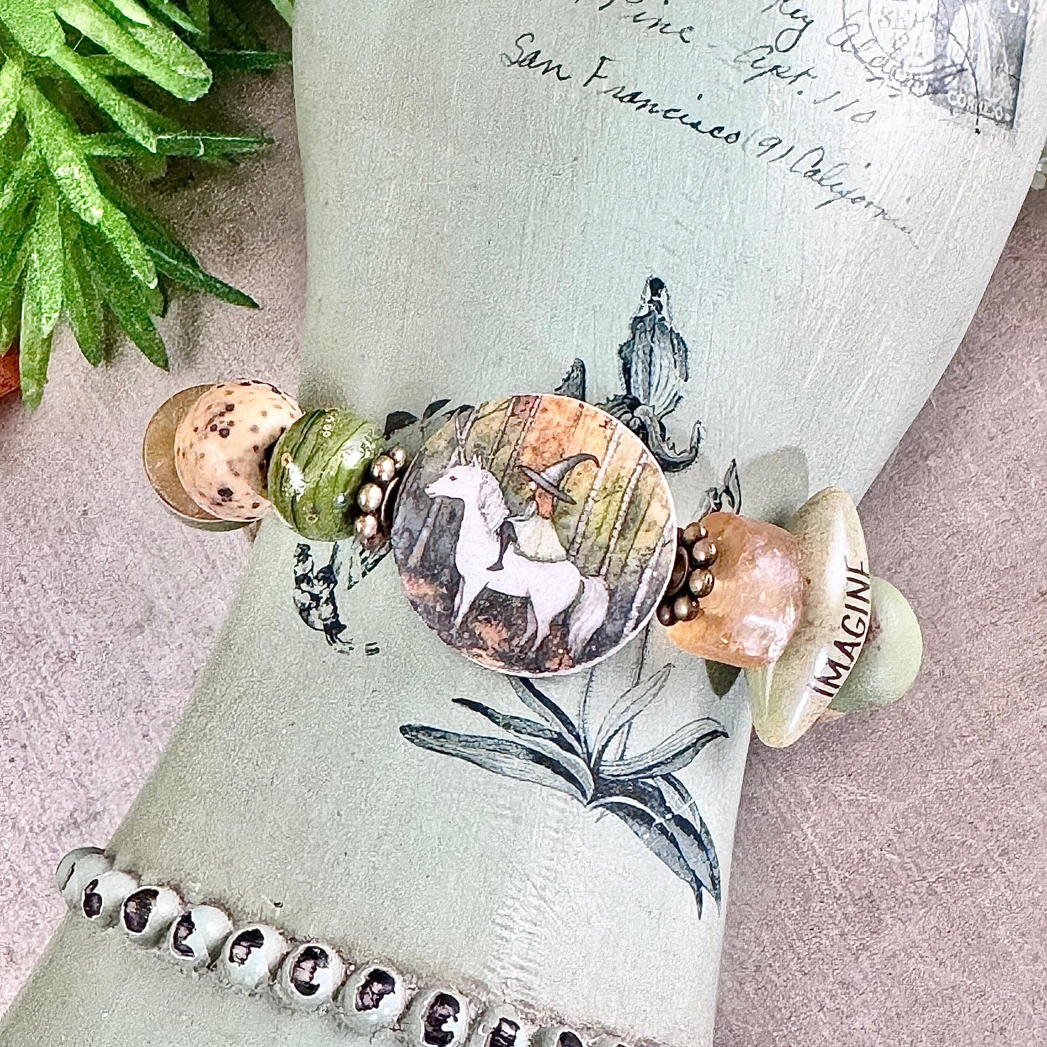 This stretch one of a kind bracelet starts out with an adorable wood focal bead with a little witch riding a unicorn through the woods. I’ve paired this with a green ceramic bead that says “imagine”, other ceramic beads include brown speckled rounds, green rounds and a green floral round. More beads include large citrine wheels, two beautiful green lamp work beads and a green African recycled glass beads. I used antique brass spacer beads throughout.